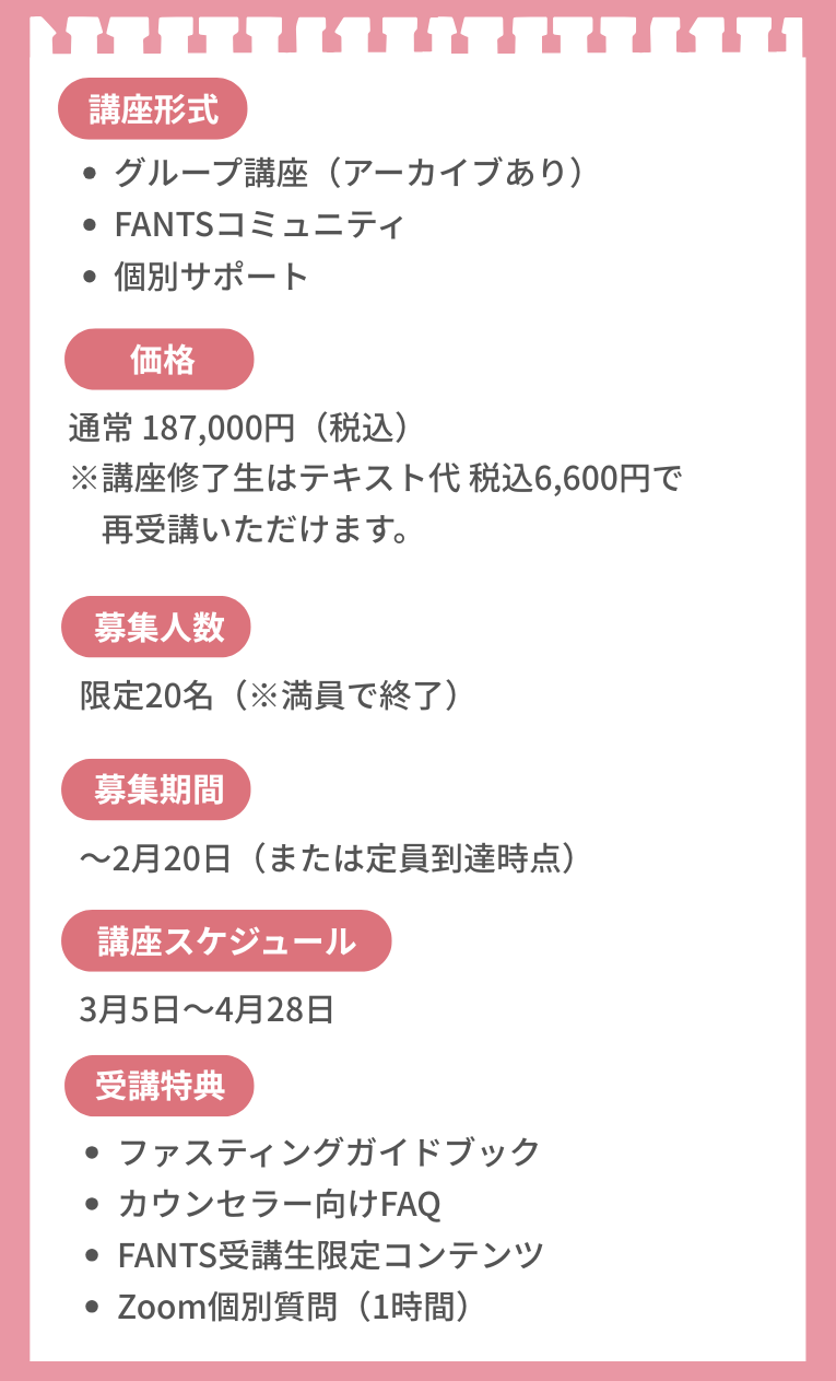 個別サポートからグループファスティング、オンライン開催まで、無理なく成果を出せる仕組みづくりを実践的に学びます。